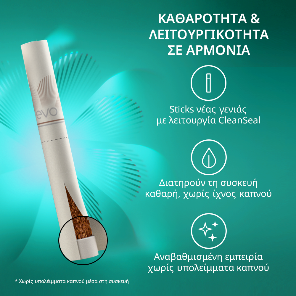 Με τη τεχνολογία CleanSeal™, τα νέα EVO Sticks προστατεύουν τη συσκευή από υπολείμματα καπνού. Απόλυτα συμβατά με όλες τις συσκευές Ploom.