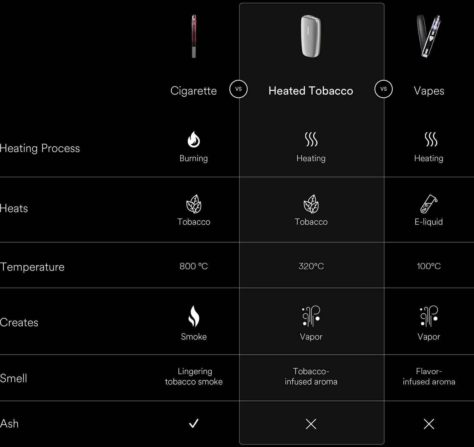 Our handy chart below will help you understand the differences between heated tobacco vs. vaping vs. smoking.